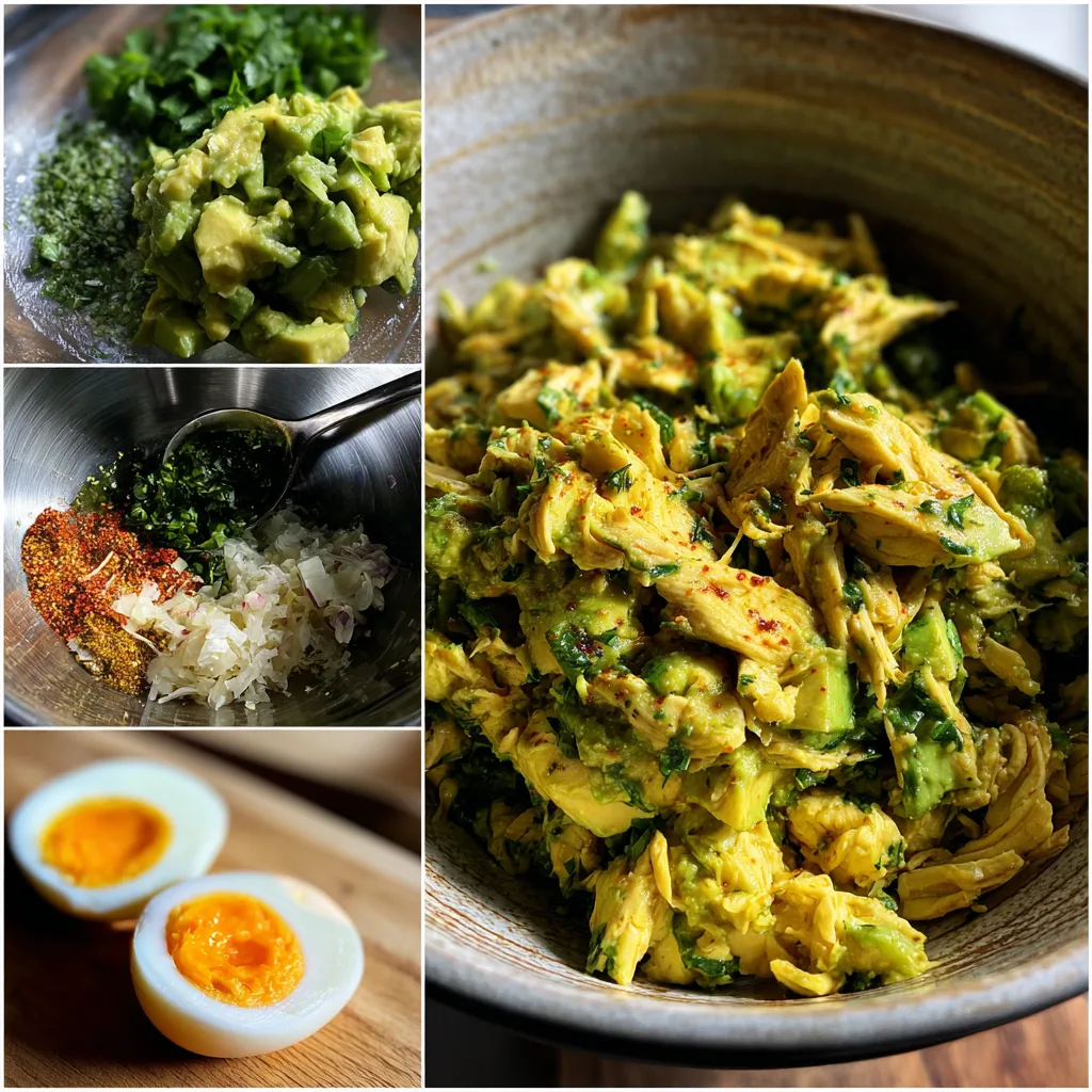Begin by shredding or dicing the cooked chicken into bite-sized pieces and placing it in a large mixing bowl. Cut the avocados in half, remove the pits, and scoop the flesh into a separate bowl. Mash the avocado gently with a fork until mostly smooth, leaving some texture.
