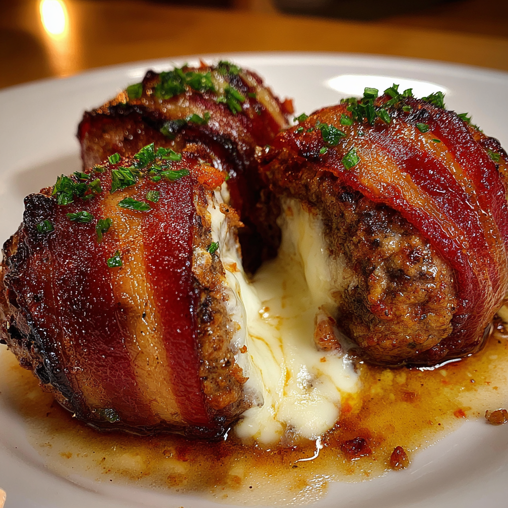Savory meatballs stuffed with melted cheese and wrapped in crispy bacon, baked to perfection for a rich and satisfying appetizer or main dish.