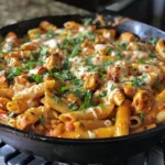 A bold and zesty one-pan Buffalo Ranch Chicken Pasta skillet featuring tender chicken, creamy ranch-seasoned sauce, spicy buffalo heat, and perfectly cooked pasta for an easy weeknight dinner.