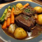 A comforting one-pot meal of tender beef slowly braised with root vegetables in a rich, savory sauce, perfect for a hearty family dinner.
