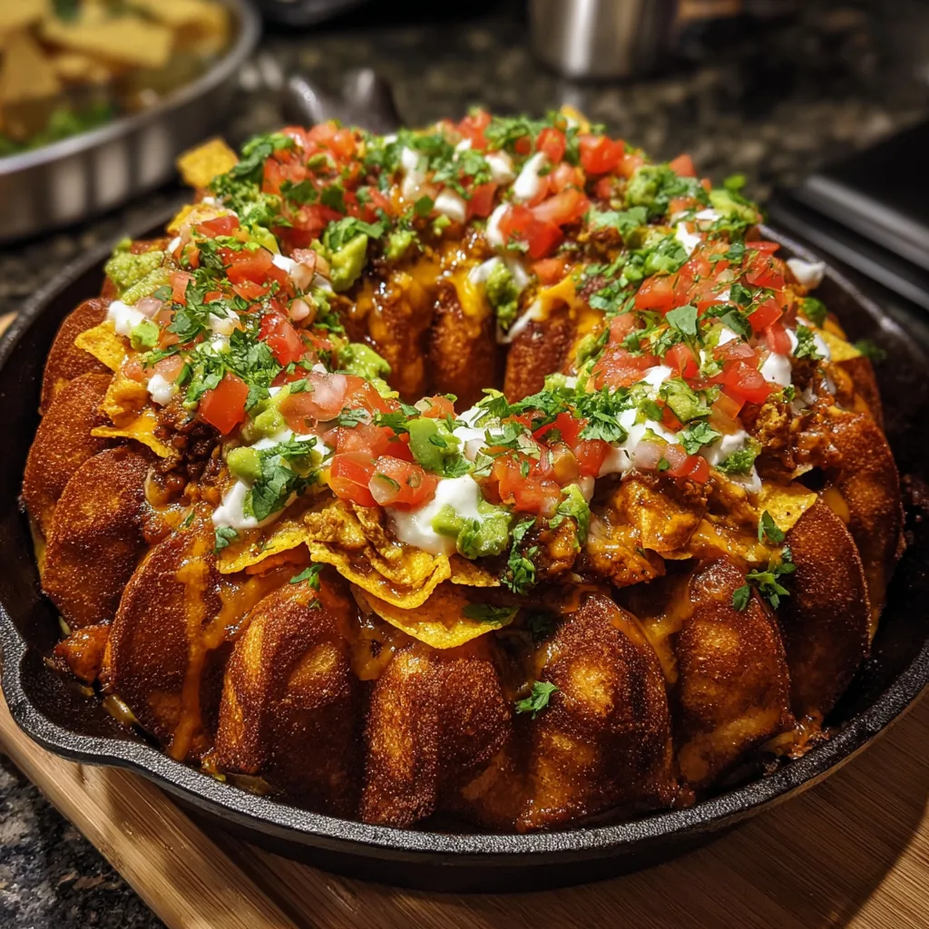 Bundt Pan Nachos are a fun, shareable party dish made by layering tortilla chips, seasoned meat, cheese, and toppings in a bundt pan, then baking and flipping for a dramatic presentation.