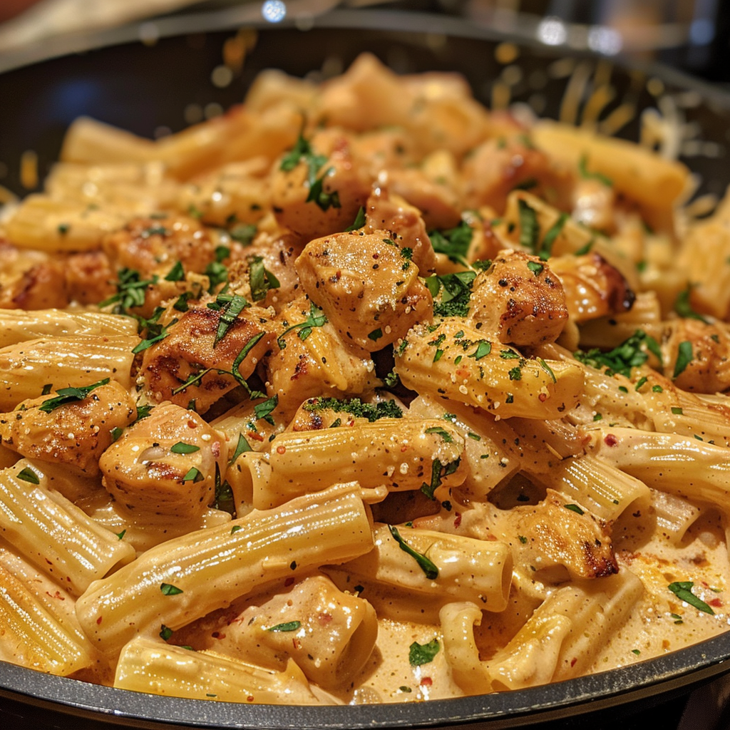 - Return chicken to the skillet and toss in the cooked rigatoni. Stir well to coat evenly with sauce. Add a splash of reserved pasta water if needed for consistency.