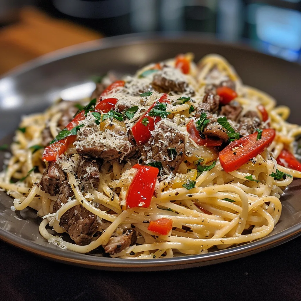 Steak Alfredo Spaghetti with Creamy Parmesan and Roasted Red Peppers