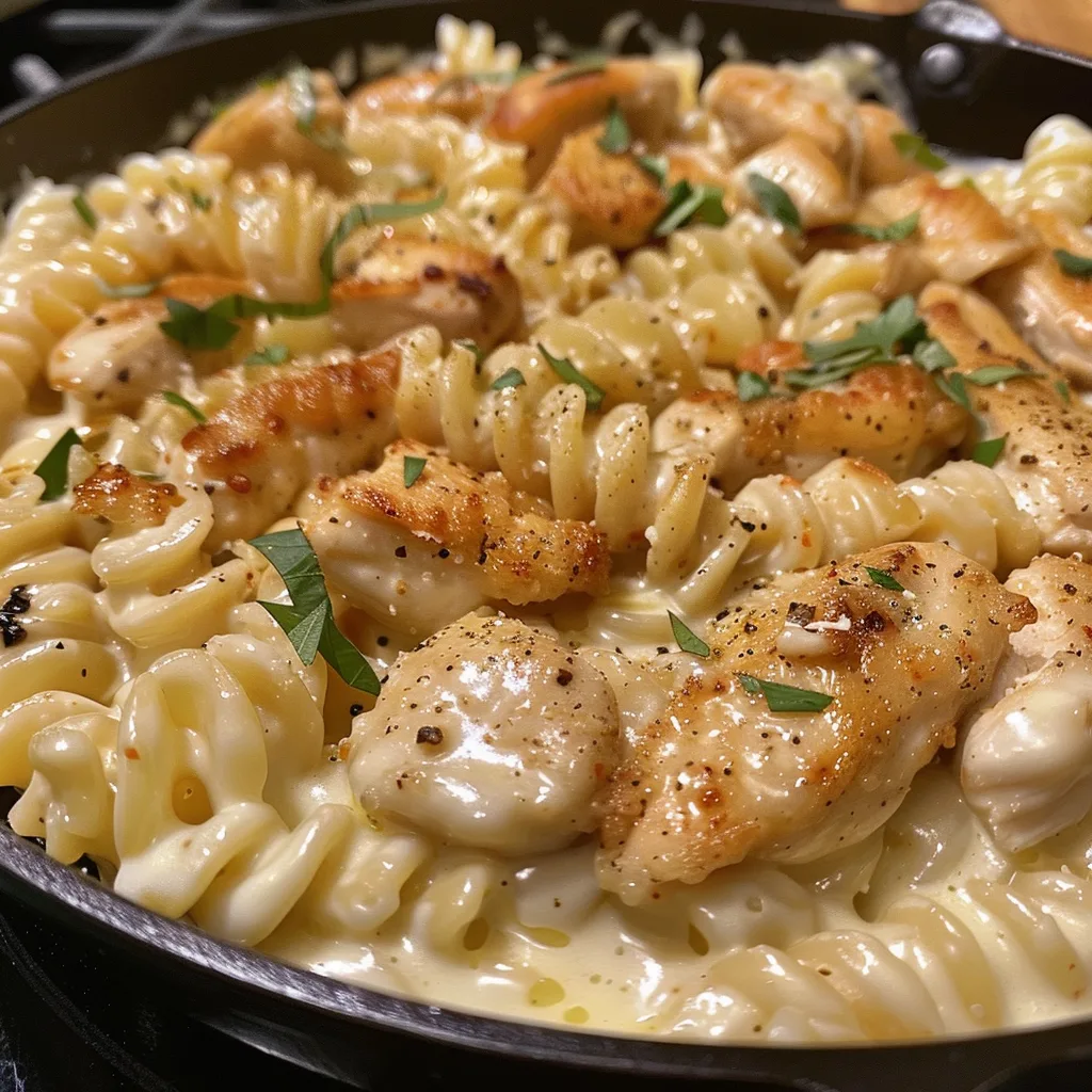 Velvety Garlic Chicken and Rotini with Mozzarella Alfredo