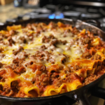 A comforting one-pan Cheesy Beef Lasagna Skillet featuring seasoned ground beef, tender pasta, rich tomato sauce, and plenty of melted cheese—all the flavor of classic lasagna without the layering.