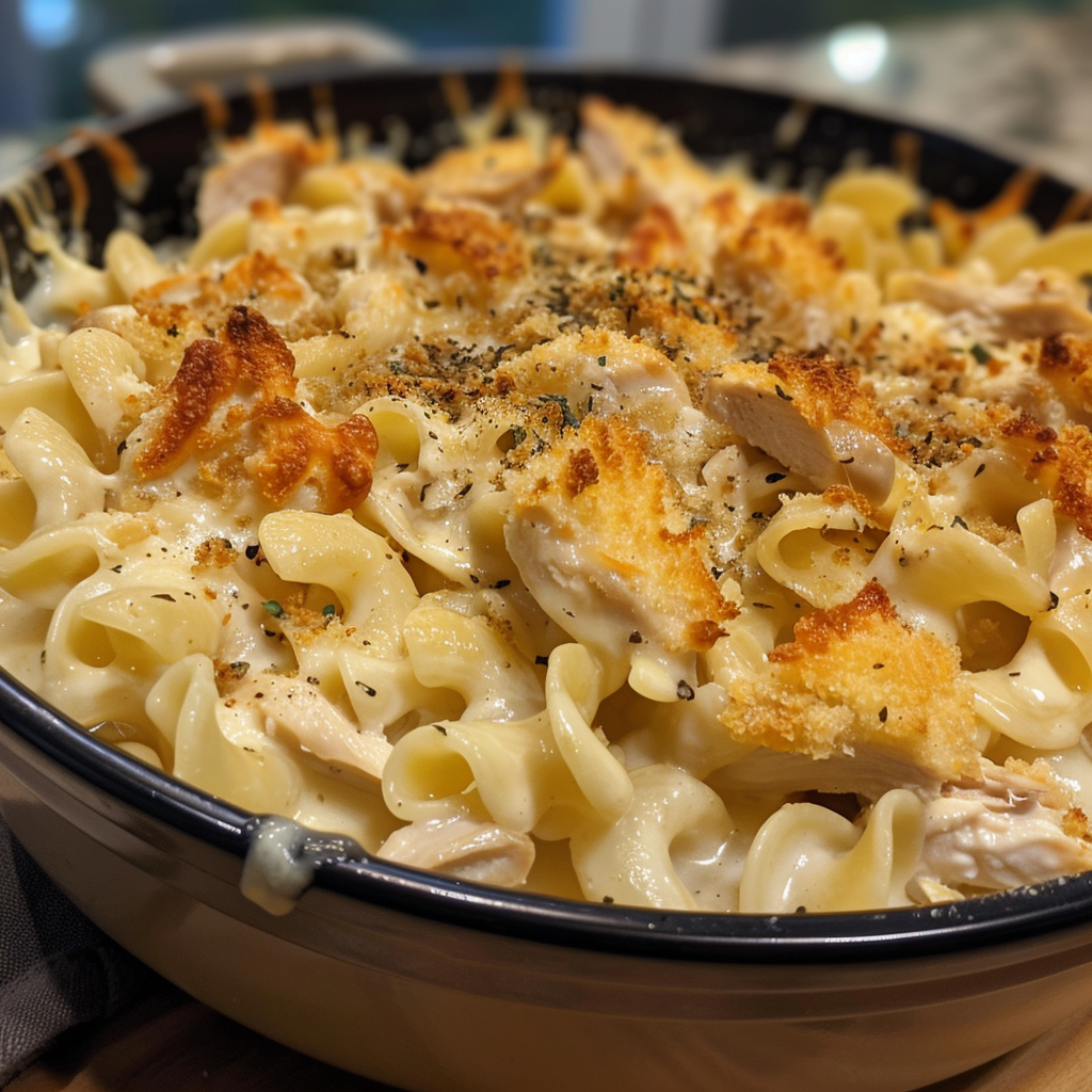 A creamy, comforting casserole loaded with tender chicken, egg noodles, and melted cheese — the ultimate cozy dinner perfect for busy weeknights or family gatherings.