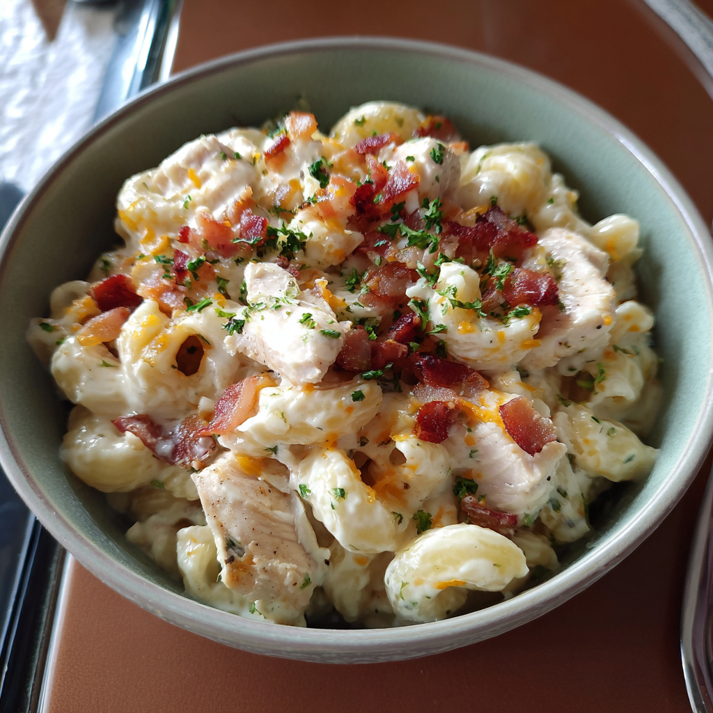 A rich and comforting pasta dish loaded with tender chicken, crispy bacon, creamy ranch-seasoned sauce, and melted cheese for the ultimate weeknight comfort meal.