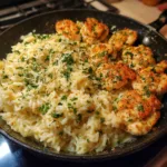 A flavorful chicken scampi served with creamy garlic rice, combining tender chicken, a rich garlic butter sauce, and a silky rice base for a comforting meal.