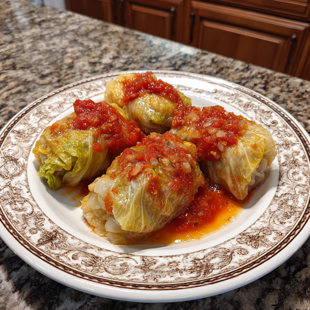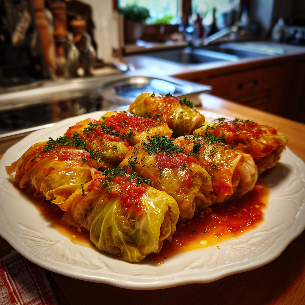 Classic stuffed cabbage rolls made with tender cabbage leaves filled with a savory mixture of ground meat and rice, slowly simmered in a rich tomato sauce for a comforting traditional meal.