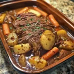 A hearty and flavorful pot roast cooked low and slow with red wine, beef broth, and aromatic vegetables, making it perfect for serving at gatherings or Sunday dinners.