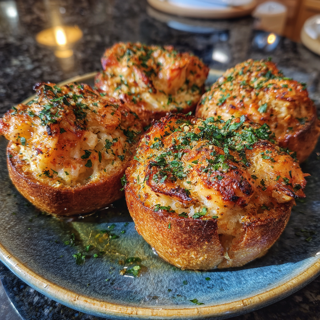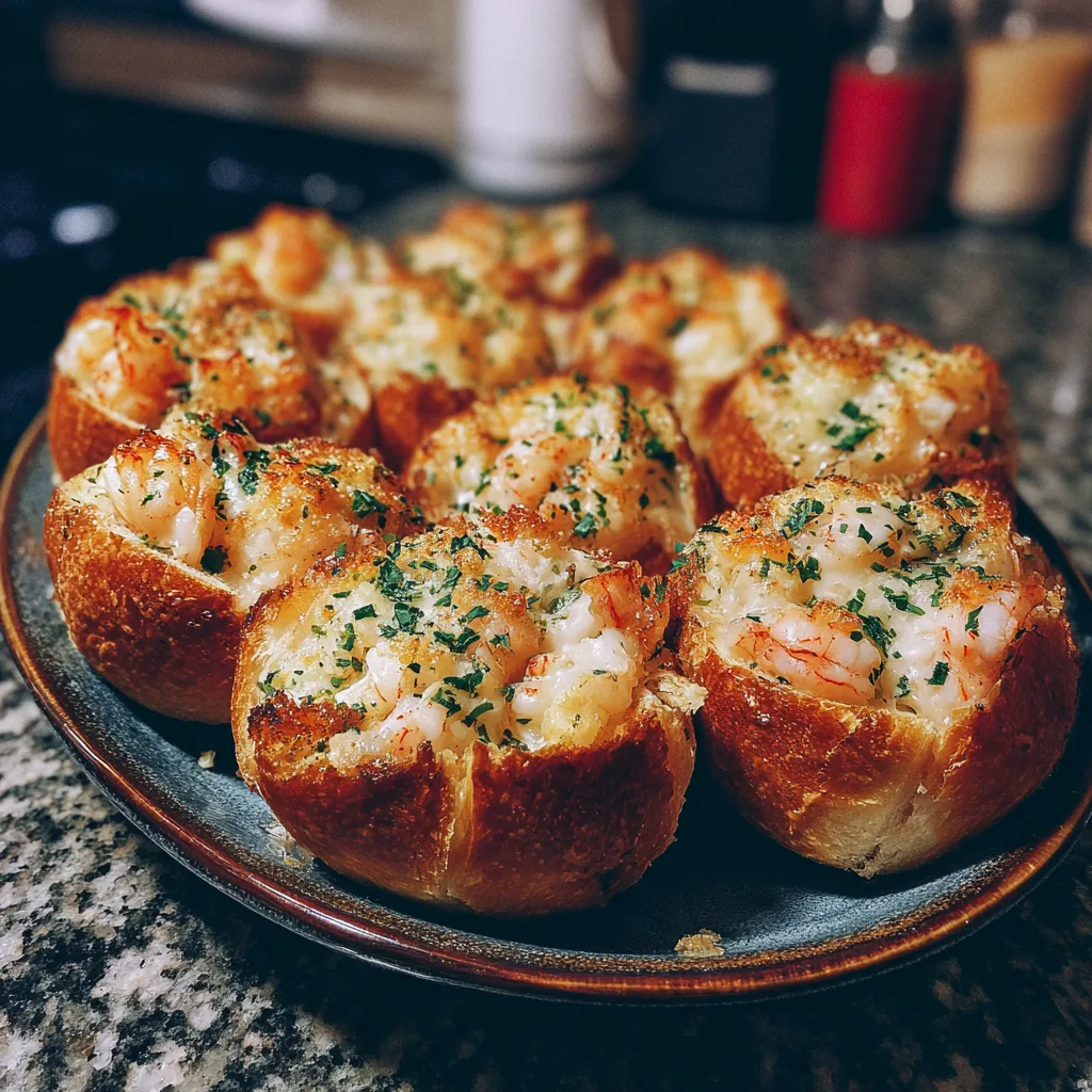 Golden garlic bread bombs stuffed with a rich, cheesy crab and shrimp filling, baked until crispy on the outside and irresistibly gooey inside.