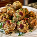 A festive and flavorful holiday appetizer made with tender turkey, savory stuffing, and tart cranberries, shaped into bite-sized balls and baked to golden perfection.