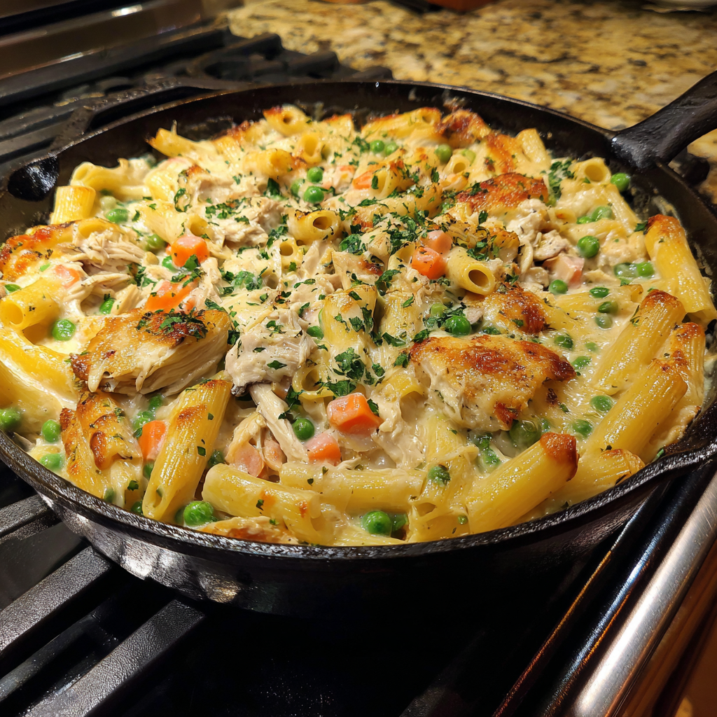 A comforting pasta bake inspired by classic chicken pot pie, featuring tender chicken, vegetables, and pasta baked in a rich, creamy sauce with a golden topping.