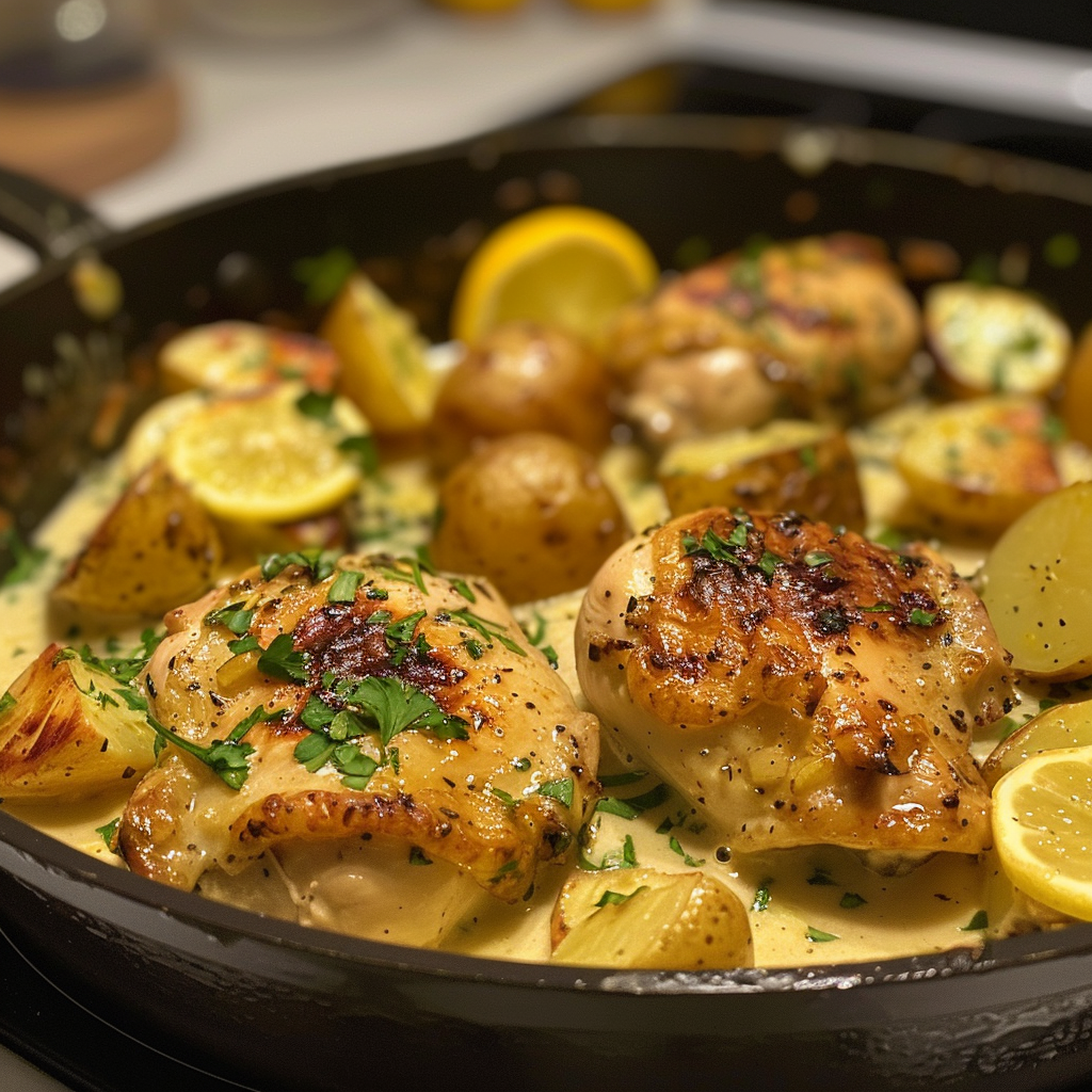This dish brings together everything you love about comfort cooking — crispy, golden chicken, tender roasted potatoes, and a creamy garlic sauce that ties it all together. The chicken stays moist thanks to pan-searing, while the sauce blends garlic, herbs, and cream into pure decadence. It’s easy to prepare, uses simple ingredients, and delivers restaurant-quality flavor in about 45 minutes. Whether you’re cooking for family or guests, this meal feels both homey and impressive.