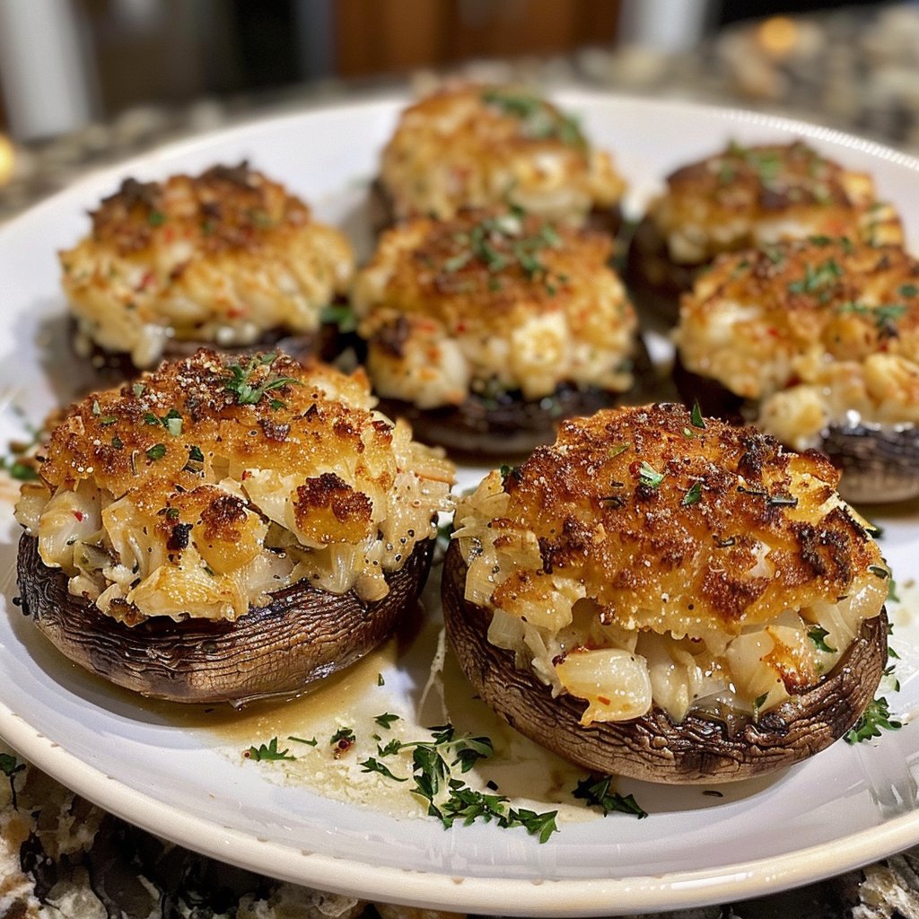Savory mushrooms filled with a rich, creamy garlic crab mixture, baked to golden perfection — an elegant appetizer or party favorite bursting with seafood flavor.
