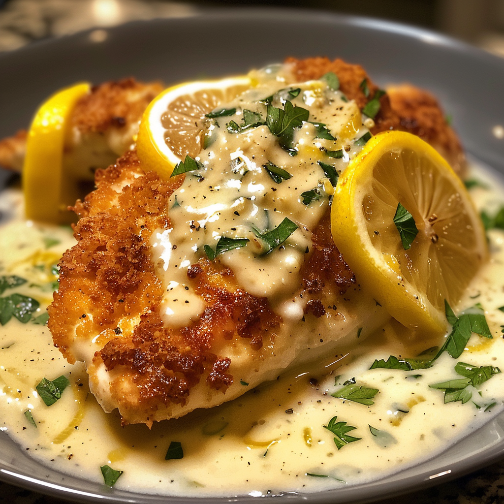 Crispy lemon and pecorino-crusted chicken breasts served with a silky, tangy creamy lemon sauce. A perfect balance of bright citrus flavor and rich, savory cheese — ideal for a comforting yet elegant dinner.