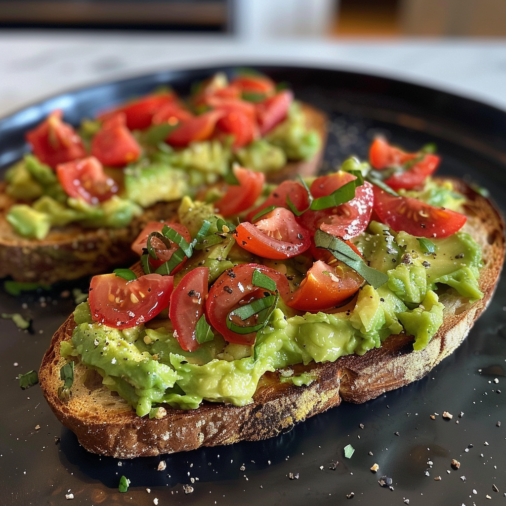 A fresh and flavorful twist on classic bruschetta, featuring creamy smashed avocado, ripe tomatoes, garlic, and herbs served on toasted bread slices.