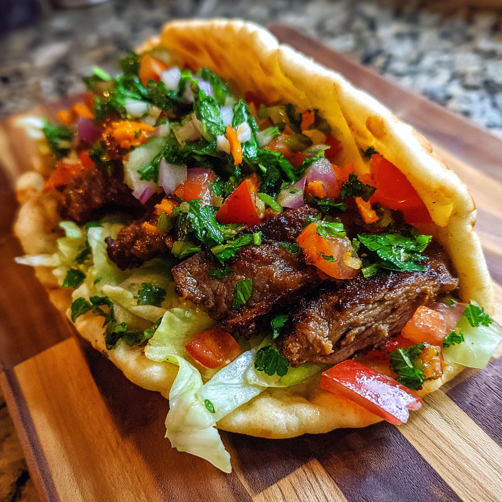 For extra flavor, drizzle some tzatziki sauce, hummus, or a bit of garlic aioli into the pita pockets. These creamy sauces complement the beef and veggies beautifully.