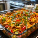 A creamy, cheesy, and flavorful Fajita Chicken Casserole loaded with tender chicken, colorful bell peppers, and Tex-Mex spices, baked to perfection for an easy weeknight meal.
