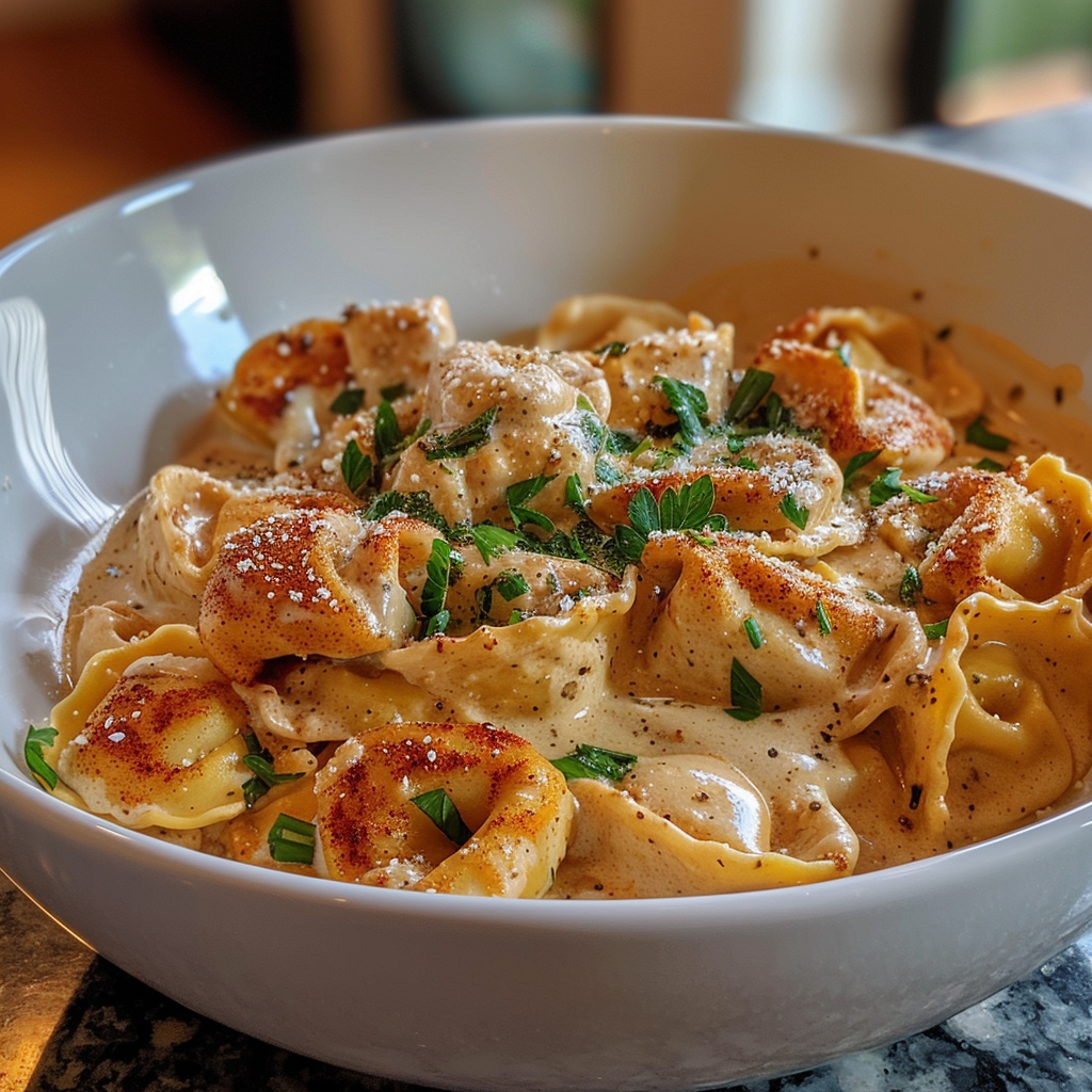 A creamy, indulgent pasta dish featuring tender garlic butter chicken and cheese-filled tortellini tossed in a Cajun-spiced Alfredo sauce.