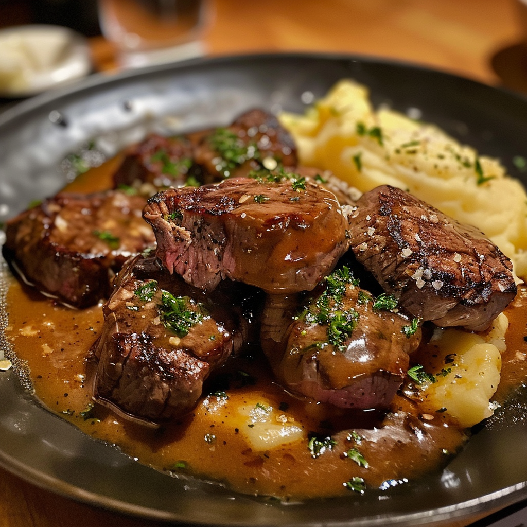 - Serve. Spoon mashed potatoes onto each plate, top with steak bites, and drizzle with the remaining garlic butter sauce. Garnish with chopped parsley for freshness.