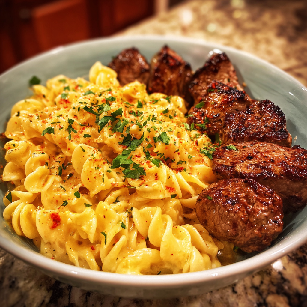 A rich and indulgent meal featuring tender garlic butter steak bites served over spicy Cajun Alfredo twisted pasta. Creamy, flavorful, and packed with bold spices — perfect for steak and pasta lovers alike!
