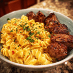 If you’re craving a restaurant-quality meal that’s bold, creamy, and utterly satisfying, this Garlic Butter Steak Bites & Spicy Cajun Alfredo Twisted Pasta is the perfect dish. Juicy, seared steak bites are coated in a rich garlic butter glaze, then paired with pasta enveloped in a spicy, velvety Cajun Alfredo sauce. It’s indulgence at its finest—comfort food with a kick! I first made this on a Friday night when I wanted something special without spending hours in the kitchen, and it instantly became a family favorite. The combination of tender steak, creamy sauce, and that Cajun spice creates a perfect harmony of heat and richness. The twisted pasta shape holds every bit of sauce, making each bite irresistible. Whether you’re cooking for guests or just treating yourself, this recipe guarantees an unforgettable dining experience that’s as satisfying as it looks.