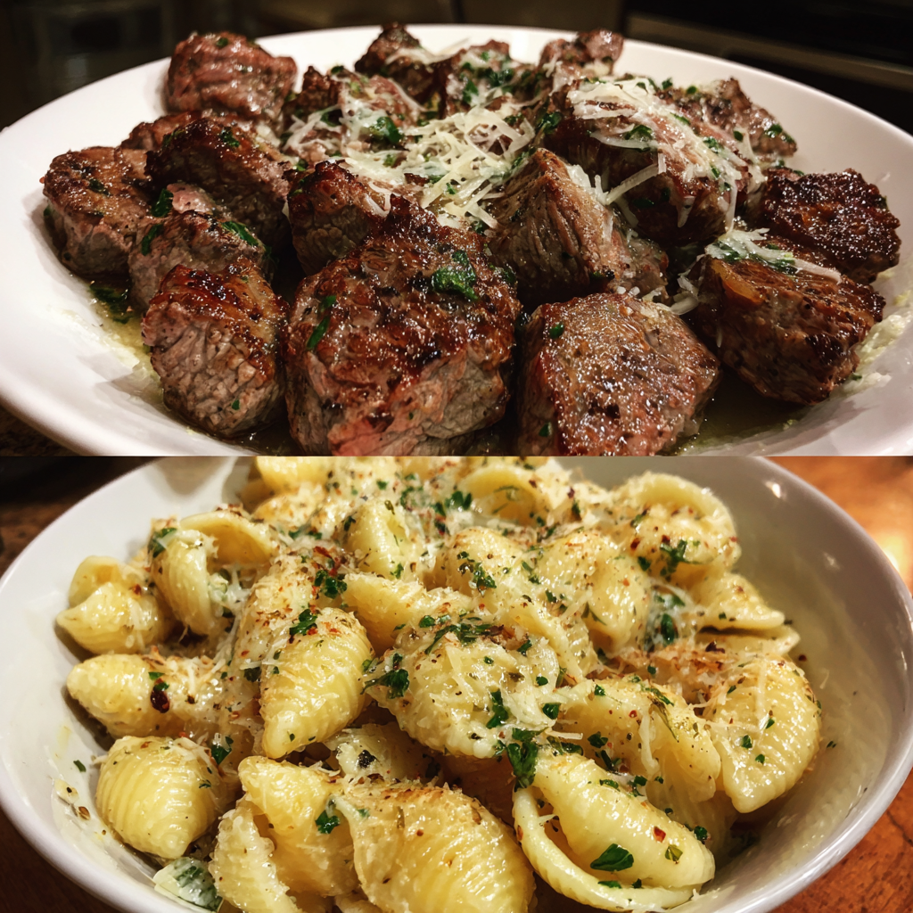 Tender garlic butter steak bites paired with creamy Parmesan pasta shells for a hearty, comforting meal.