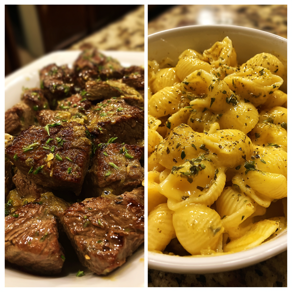 Garlic Butter Steak Tips with Cheesy Shells in Cheddar Sauce