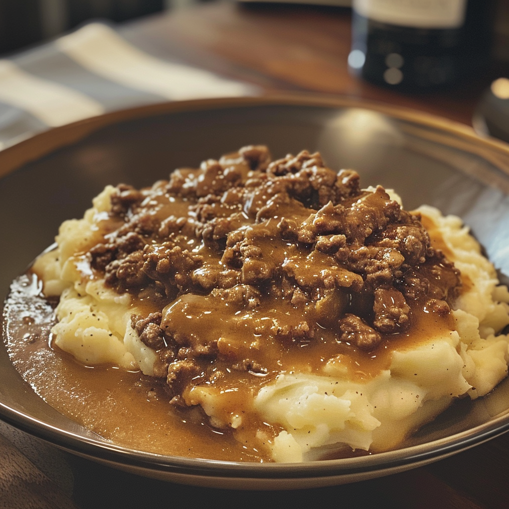 A comforting classic featuring seasoned ground beef simmered in a rich brown gravy, served over creamy mashed potatoes. Simple, hearty, and perfect for a weeknight dinner.