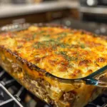 A classic comfort food casserole made with layers of seasoned ground beef, tender potatoes, creamy sauce, and melted cheese — hearty, filling, and perfect for family dinners.