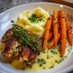 A comforting and wholesome dish featuring juicy herb-marinated chicken served with creamy mashed potatoes and honey-glazed carrots. Perfect for a hearty family dinner or a cozy weekend meal.