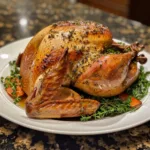 A mouthwatering roasted turkey glazed with a sweet and spicy hot honey butter — juicy on the inside, golden and caramelized on the outside. Perfect for holidays or special gatherings.