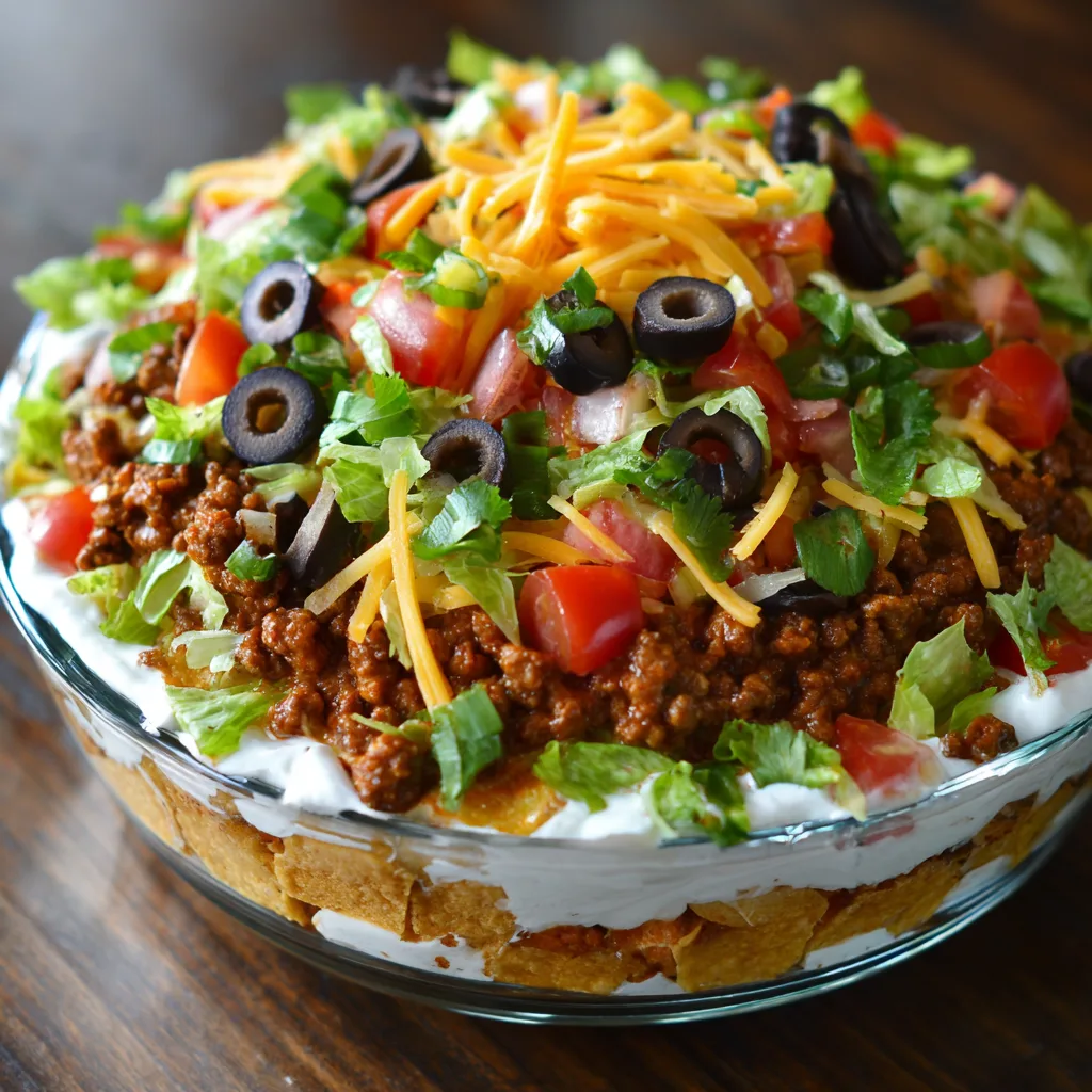 Layered Taco Salad Dip is a guaranteed centerpiece for parties, potlucks, and casual get-togethers. It combines the bold, familiar flavors of a taco salad with the convenience of a shareable dip, making it both practical and irresistible. I appreciate how this recipe delivers layers of texture and flavor in every scoop, from creamy and savory to fresh and crunchy. It is visually appealing, easy to assemble, and does not require baking, which makes it ideal when time is limited. I have served this dip for game days and family gatherings, and it always disappears quickly. The balance of seasoned protein, creamy elements, and fresh vegetables keeps it from feeling heavy, while still being satisfying. It is also highly customizable, allowing you to adapt it to dietary preferences or what you have available.