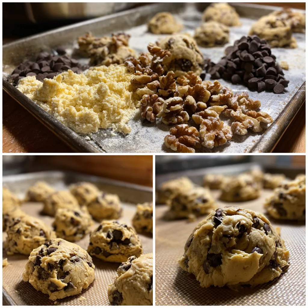 Fold in the chocolate chips and chopped walnuts if using. Divide the dough into large portions—about 6 ounces each—to create the signature oversized cookies. Gently shape each portion into a tall mound rather than flattening it.