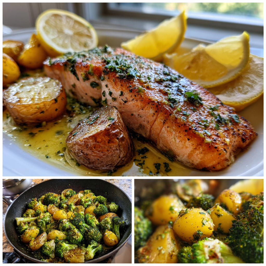 A vibrant, restaurant-quality dinner featuring flaky salmon drizzled with lemon butter, paired with crispy roasted potatoes and tender broccoli for a truly satisfying, balanced meal.