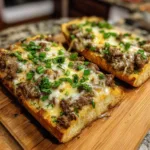 A decadent fusion of Philly cheesesteak and garlic bread, featuring tender shaved steak, melty cheese, sautéed peppers and onions, all piled onto buttery garlic bread and baked until golden.