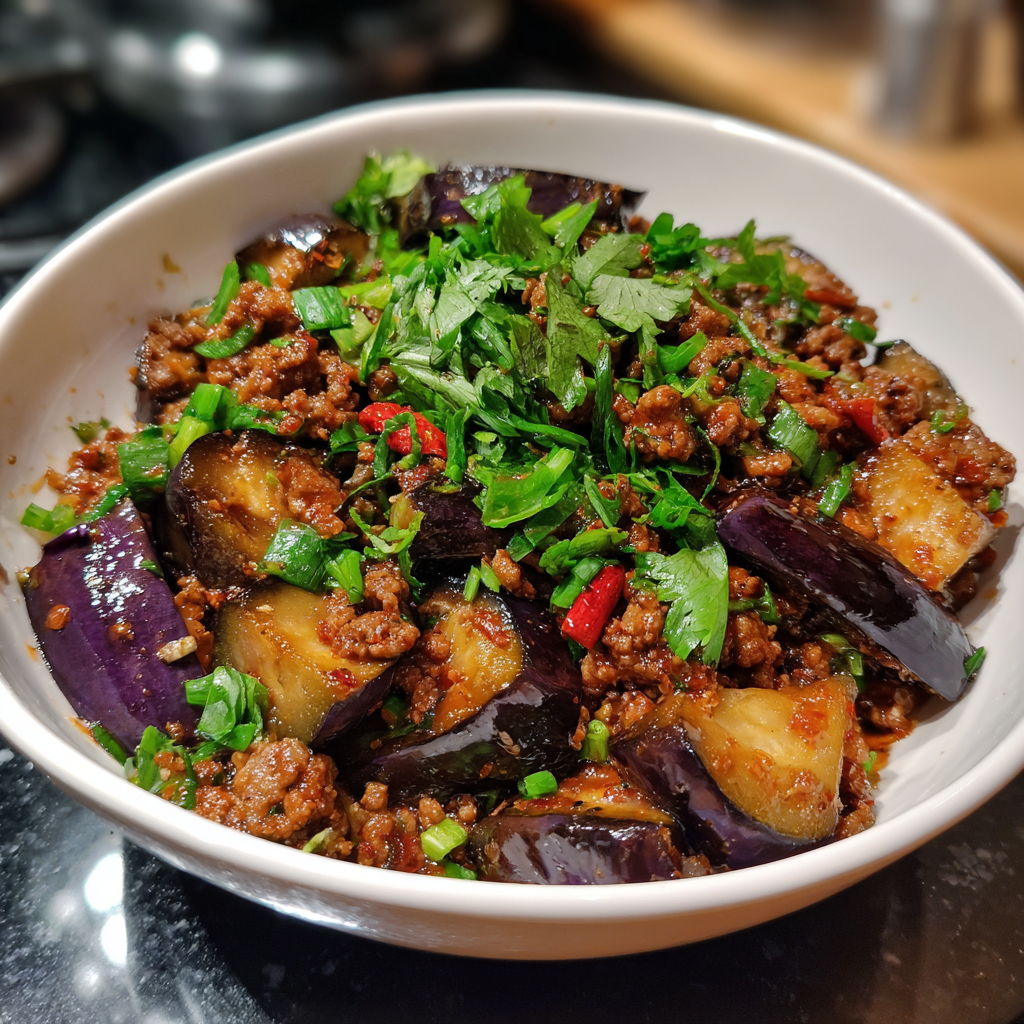 A savory and comforting dish made with tender eggplant cooked in a rich, spiced minced beef sauce, perfect for a hearty family meal.