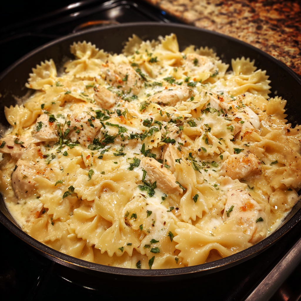 Return the chicken to the skillet and toss in the cooked bowtie pasta. Coat everything evenly in the cheesy cream sauce. Taste and adjust seasoning as needed.