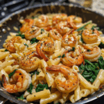This One-Pan Creamy Garlic Shrimp & Spinach Pasta is the perfect combination of elegance and ease. With tender shrimp, silky garlic sauce, and fresh spinach folded in, it delivers a restaurant-quality experience without the hassle. Every bite offers rich, creamy comfort balanced by freshness and lightness. Whether you’re cooking for guests or making a cozy dinner for two, this dish will impress every time—simple, satisfying, and effortlessly delicious.
