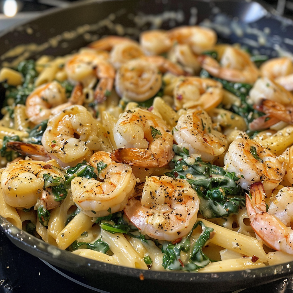 A delicious one-pan creamy garlic shrimp and spinach pasta featuring tender shrimp sautéed in a buttery garlic sauce, tossed with fresh spinach and pasta in a rich, creamy Parmesan sauce.