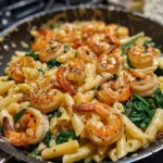 A delicious one-pan creamy garlic shrimp and spinach pasta featuring tender shrimp sautéed in a buttery garlic sauce, tossed with fresh spinach and pasta in a rich, creamy Parmesan sauce.