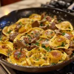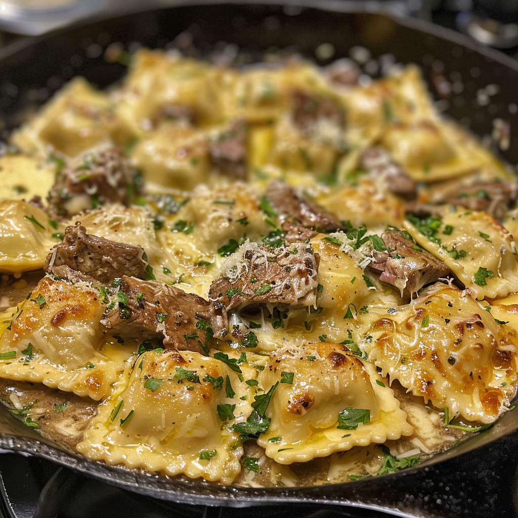 A rich and savory one-skillet meal featuring tender steak bites, cheesy ravioli, and a luscious garlic butter sauce finished with parmesan and herbs.