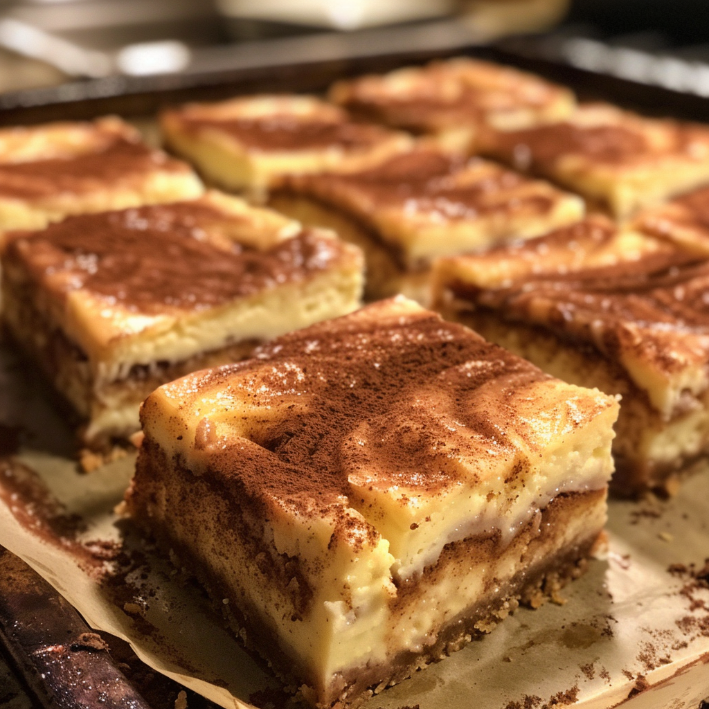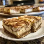 Decadent cheesecake bars layered with cinnamon roll flavor, featuring a buttery crust, creamy cheesecake filling, and a gooey cinnamon sugar swirl topped with sweet glaze.