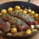 There is something deeply satisfying about a well-seared steak paired with crispy potatoes and sweet caramelized onions. Pan-Seared Steak with Potatoes and Onions is the kind of meal that feels rustic yet refined, simple yet impressive. The beauty of this recipe lies in its balance—tender, juicy steak contrasts beautifully with golden potatoes and soft, flavorful onions. I once tried finishing the potatoes in the same pan after searing the steak, allowing them to absorb the savory drippings, and the result was extraordinary. This dish requires only a handful of everyday ingredients, yet it delivers bold, comforting flavors that make it ideal for both weeknight dinners and special occasions. With the right technique and a hot skillet, you can achieve a steakhouse-quality meal in your own kitchen, all while keeping cleanup minimal thanks to the one-pan method.
