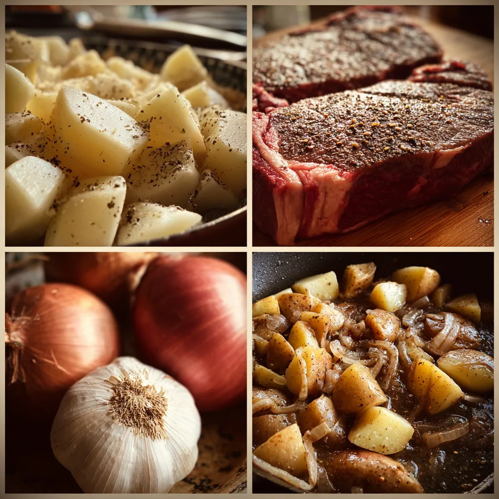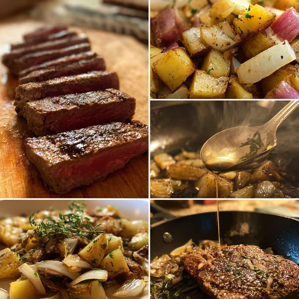 A hearty and flavorful pan-seared steak served with crispy golden potatoes and caramelized onions, all cooked together in a single skillet for an easy, satisfying meal.