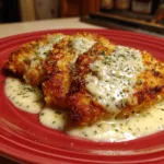 Crispy Parmesan-crusted chicken breasts served with a rich and creamy garlic sauce for a flavorful and comforting meal.