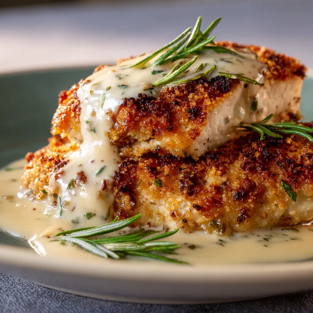 Parmesan Crusted Chicken with Creamy Garlic Sauce is a crispy, golden-breaded chicken dish topped with a rich and velvety garlic cream sauce, making it a comforting and flavorful meal perfect for weeknight dinners.