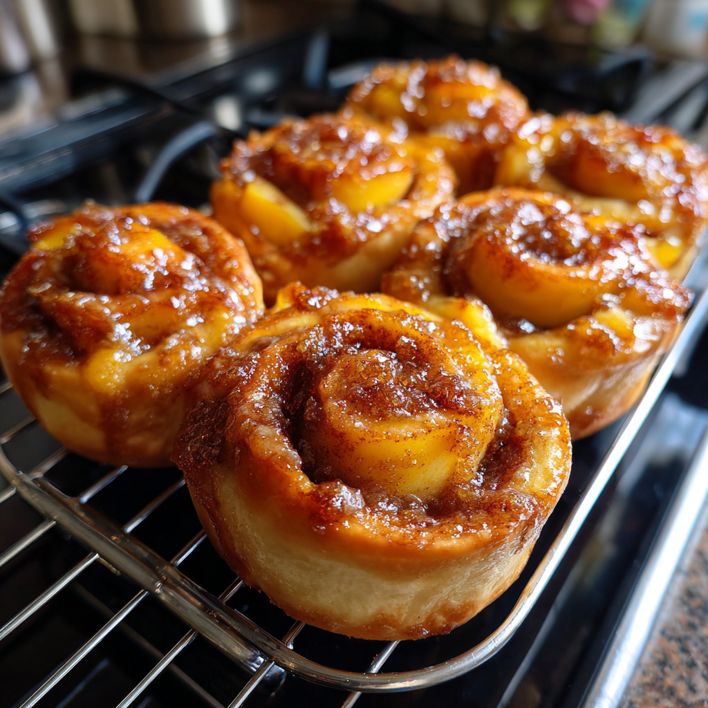 Soft and fluffy cinnamon rolls filled with a sweet peach cobbler mixture, baked until golden, and finished with a drizzle of glaze for a fruity twist on a classic breakfast treat.