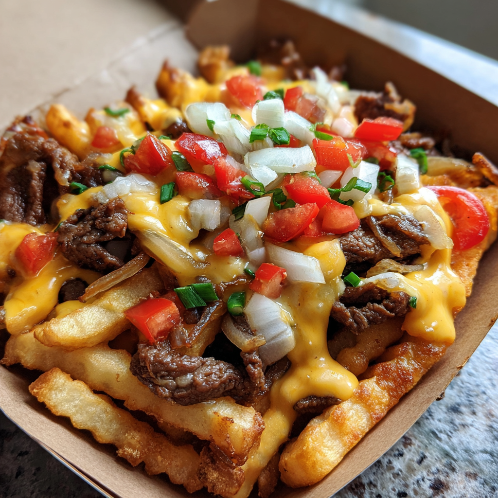 Crispy golden fries loaded with tender slices of Philly steak, sautéed onions and peppers, and smothered in gooey melted cheese — the ultimate comfort food fusion of Philly cheesesteak and loaded fries.